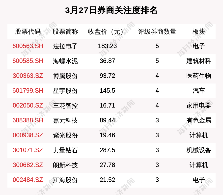 从券商对个股的关注程度来看,有21只个股获得多家券商关注,券商关注数量排名居前的个股是法拉电子(600563.SH)、海螺水泥(600585.SH)、博腾股份(300363.SZ)。
