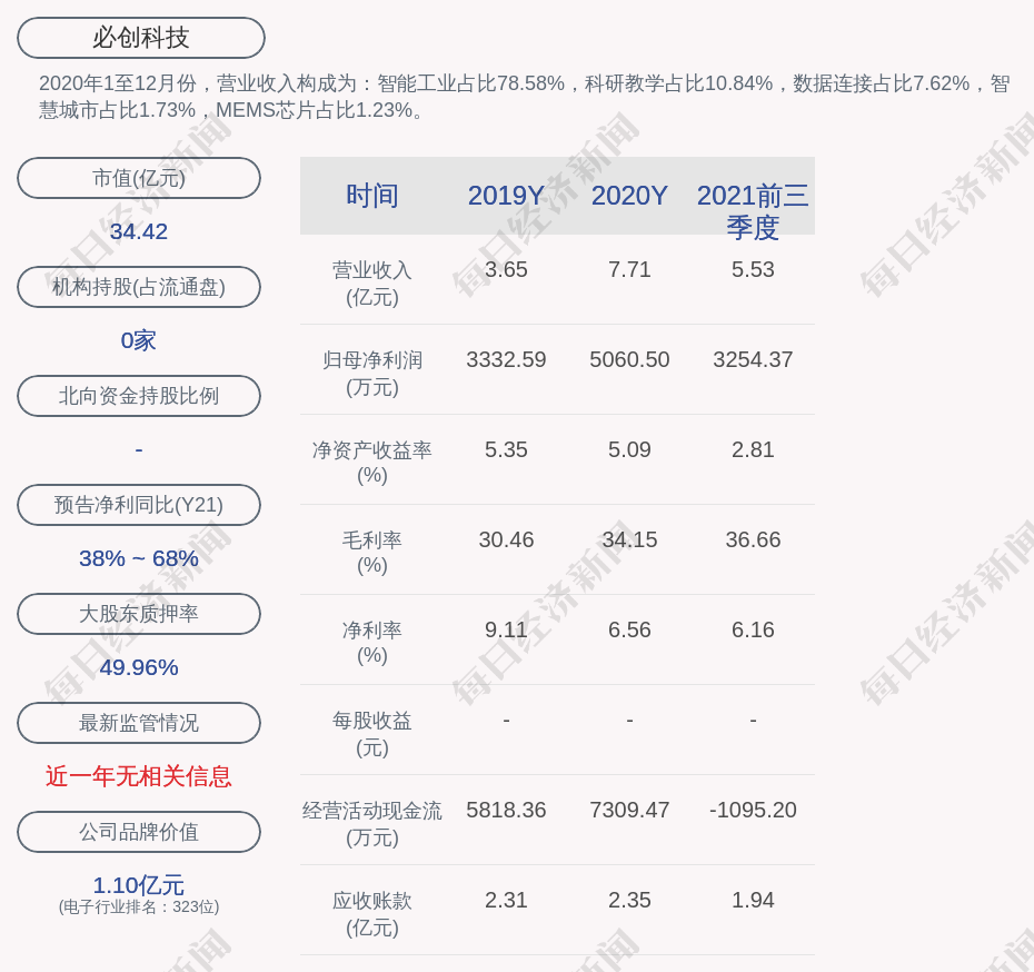 2020年1至12月份,必创科技的营业收入构成为:智能工业占比78.58%,科研教学占比10.84%,数据连接占比7.62%,智慧城市占比1.73%,MEMS芯片占比1.23%。