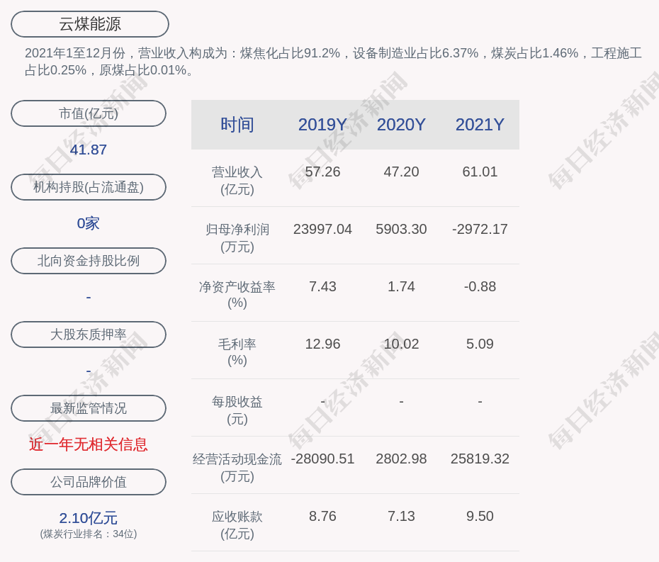 2021年1至12月份,云煤能源的营业收入构成为:煤焦化占比91.2%,设备制造业占比6.37%,煤炭占比1.46%,工程施工占比0.25%,原煤占比0.01%。