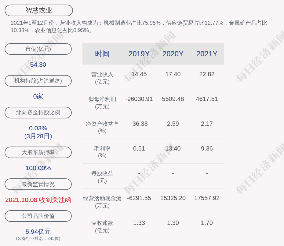2021年1至12月份,智慧农业的营业收入构成为:机械制造业占比75.95%,供应链贸易占比12.77%,金属矿产品占比10.33%,农业信息化占比0.95%。