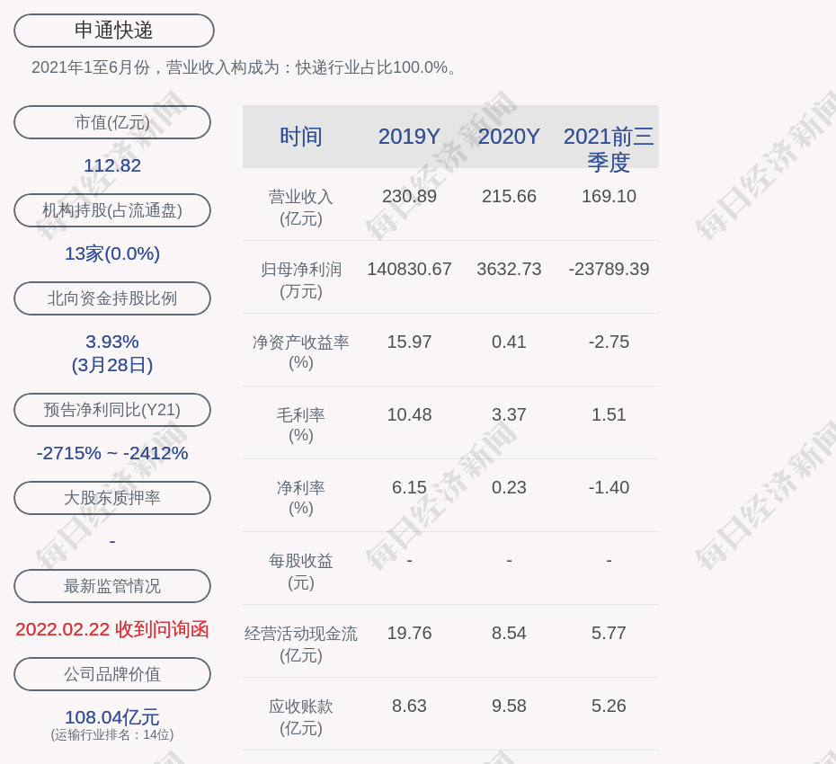 2021年1至6月份,申通快递的营业收入构成为:快递行业占比100.0%。