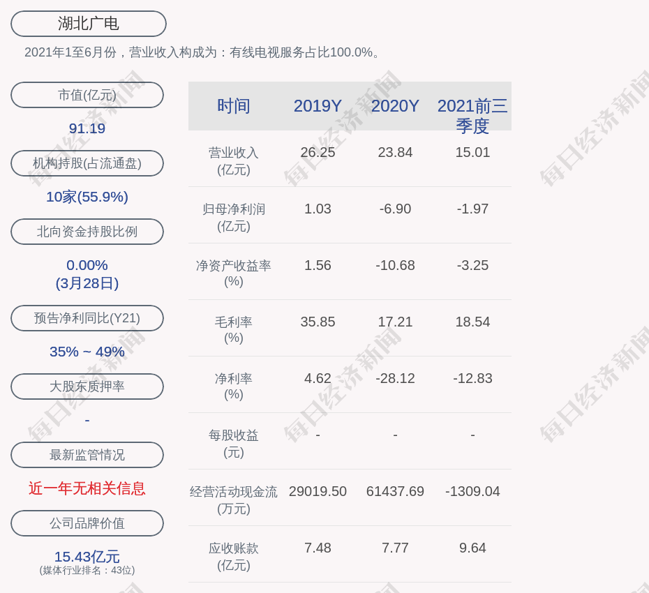 2021年1至6月份,湖北广电的营业收入构成为:有线电视服务占比100.0%。