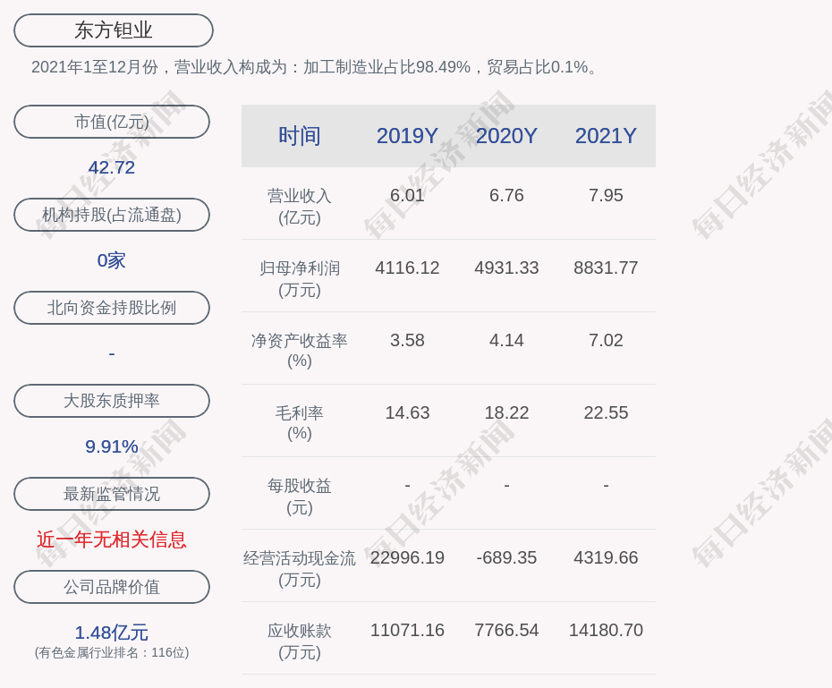 2021年1至12月份,东方钽业的营业收入构成为:加工制造业占比98.49%,贸易占比0.1%。