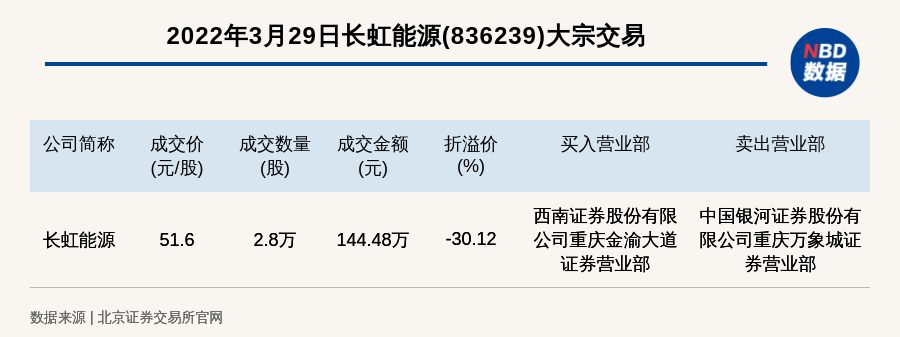 每经讯,2022年3月29日,北交所上市公司长虹能源(836239)发生一笔大宗交易,成交价51.6元/股,成交数量2.8万股,成交金额144.48万元,折价30.12%。买入营业部是西南证券股份有限公司重庆金渝大道证券营业部,卖出营业部是中国银河证券股份有限公司重庆万象城证券营业部。
