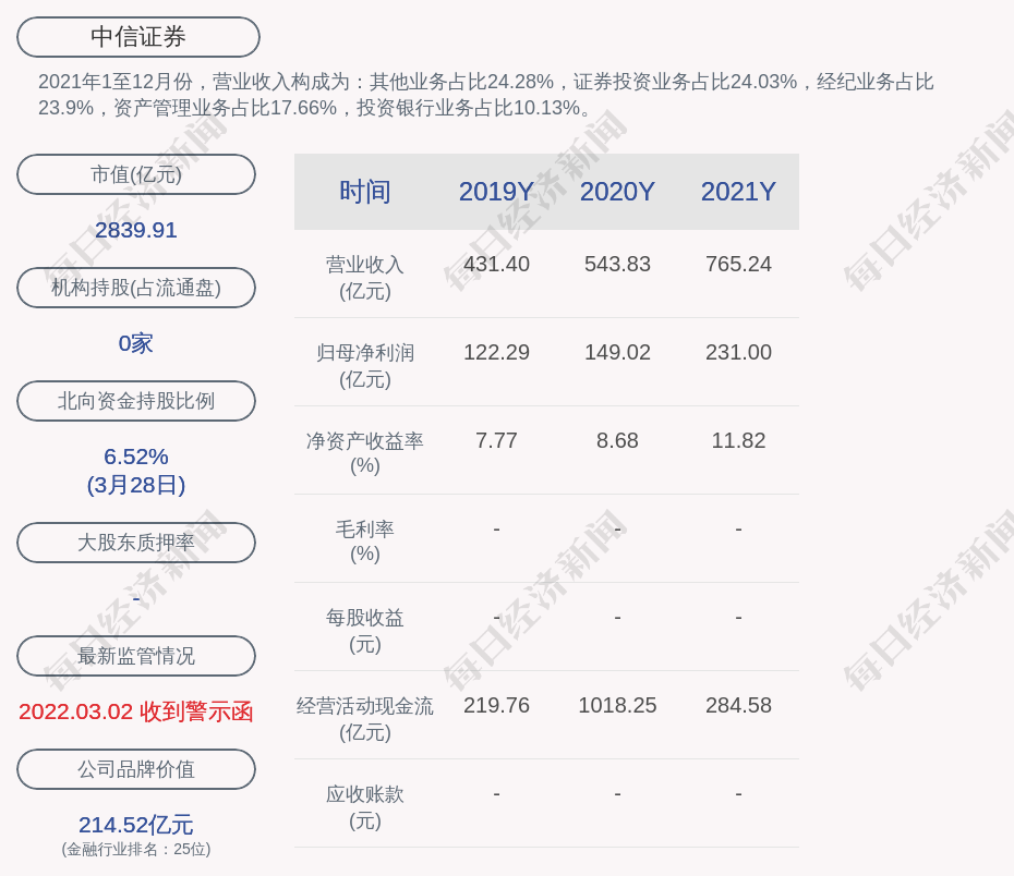 2021年1至12月份,中信证券的营业收入构成为:其他业务占比24.28%,证券投资业务占比24.03%,经纪业务占比23.9%,资产管理业务占比17.66%,投资银行业务占比10.13%。