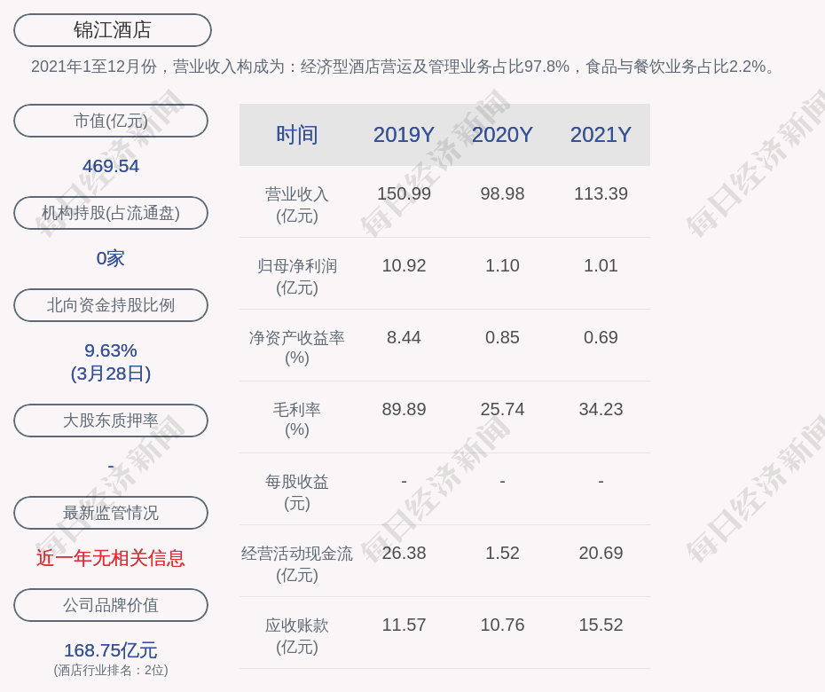 2021年1至12月份,锦江酒店的营业收入构成为:经济型酒店营运及管理业务占比97.8%,食品与餐饮业务占比2.2%。