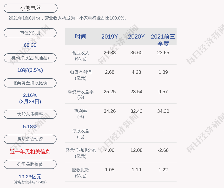1. 小熊电器近30日内北向资金持股量增加4.25万股,占流通股比例增加0.06%;
