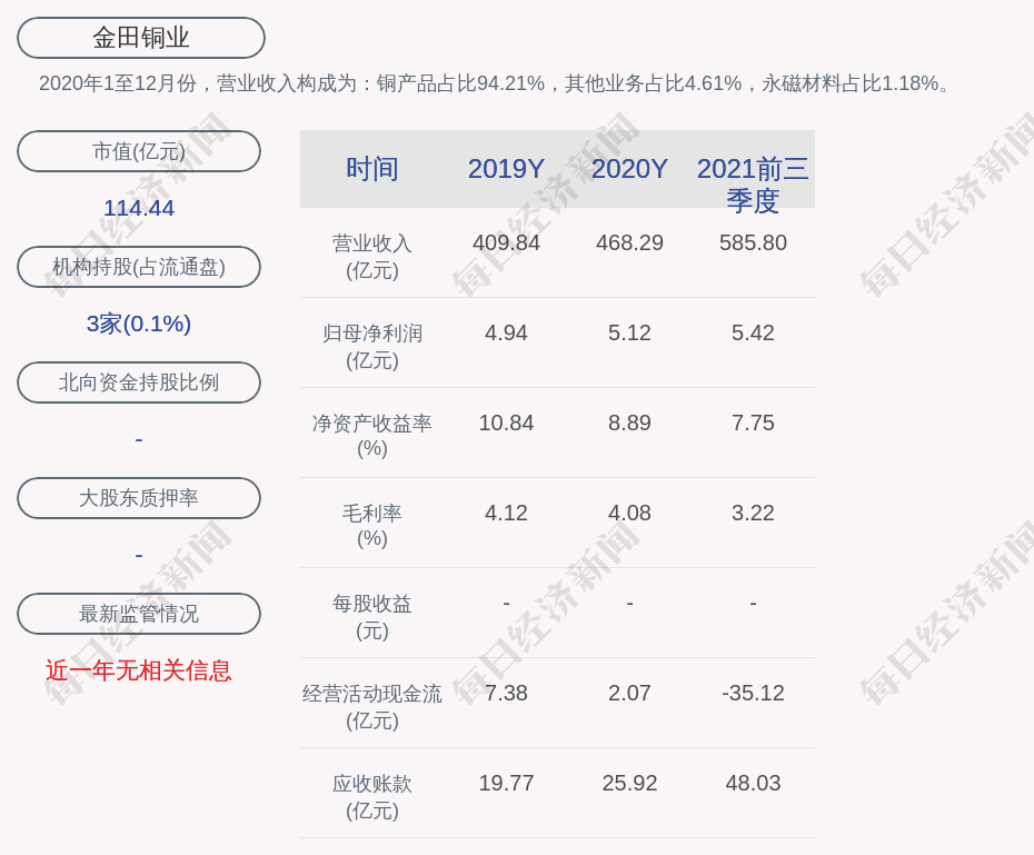 2020年1至12月份,金田铜业的营业收入构成为:铜产品占比94.21%,其他业务占比4.61%,永磁材料占比1.18%。