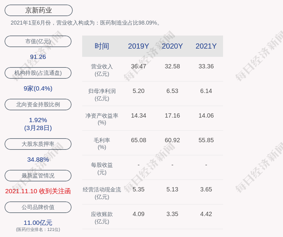 每经AI快讯,京新药业(SZ 002020,收盘价:10.08元)3月29日晚间发布年度业绩报告称,2021年营业收入约33.36亿元,同比增加2.39%;归属于上市公司股东的净利润盈利约6.14亿元,同比减少5.98%;基本每股收益盈利0.75元,同比减少8.54%。