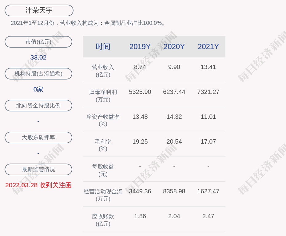 2021年1至12月份,津荣天宇的营业收入构成为:金属制品业占比100.0%。