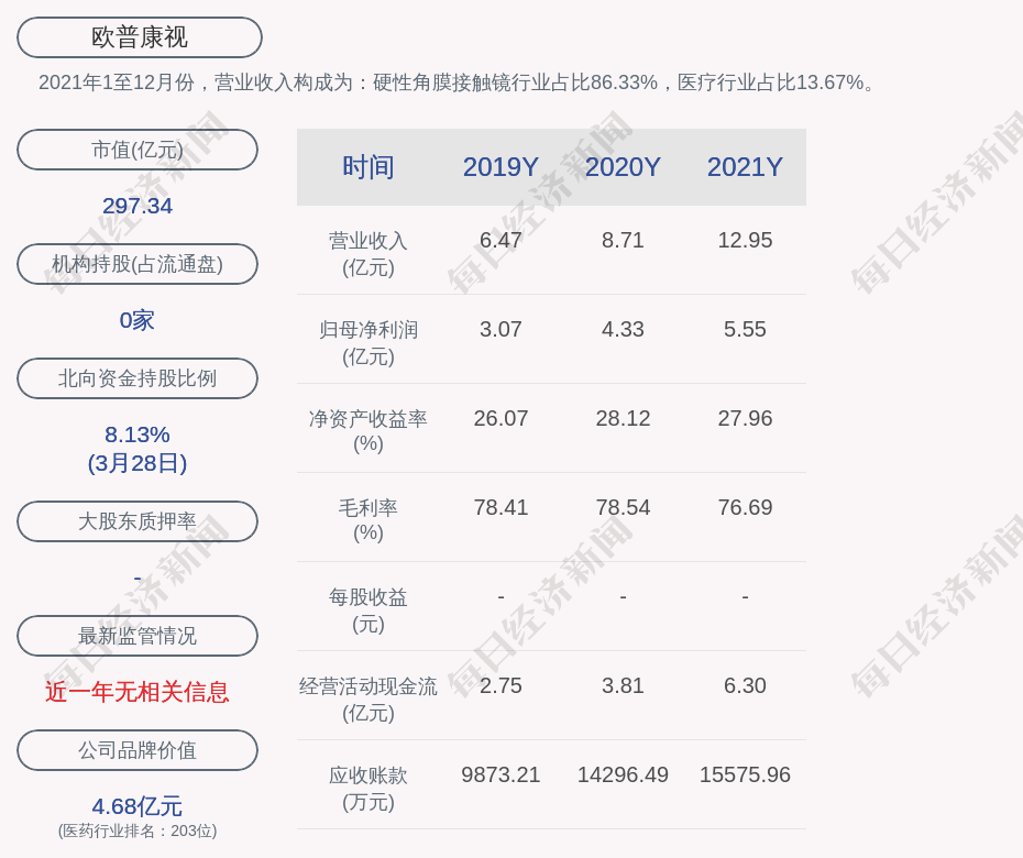 2021年1至12月份,欧普康视的营业收入构成为:硬性角膜接触镜行业占比86.33%,医疗行业占比13.67%。