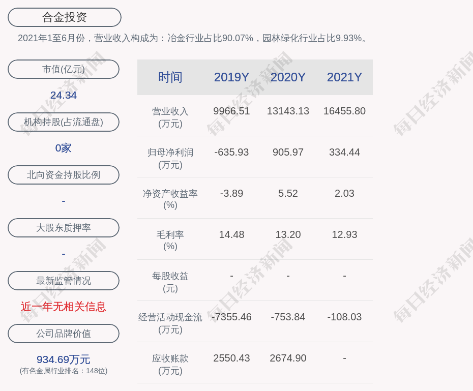 2021年1至6月份,合金投资的营业收入构成为:冶金行业占比90.07%,园林绿化行业占比9.93%。