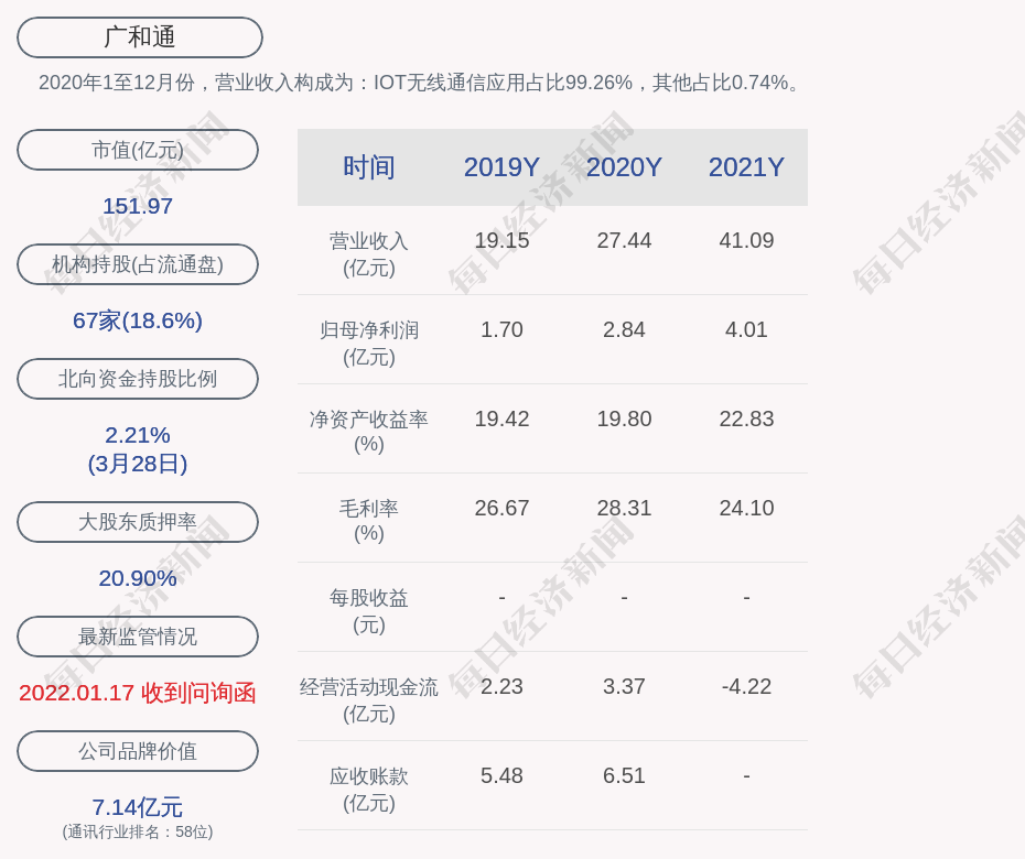 每经AI快讯,广和通(SZ 300638,收盘价:36.7元)3月29日晚间发布年度业绩报告称,2021年营业收入约41.09亿元,同比增加49.78%;归属于上市公司股东的净利润盈利约4.01亿元,同比增加41.51%;基本每股收益盈利0.97元,同比增加40.58%。拟每10股派发现金红利2元(含税)、不送红股、以资本公积金向全体股东每10股转增5股。