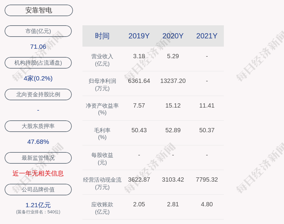 每经AI快讯,安靠智电(SZ 300617,收盘价:42.3元)3月29日晚间发布年度业绩报告称,2021年营业收入约8.06亿元,同比增加52.35%;归属于上市公司股东的净利润盈利约2亿元,同比增加50.92%;基本每股收益盈利1.36元,同比增加30.77%。拟每10股派发现金红利5元(含税)、不送红股、不转增。