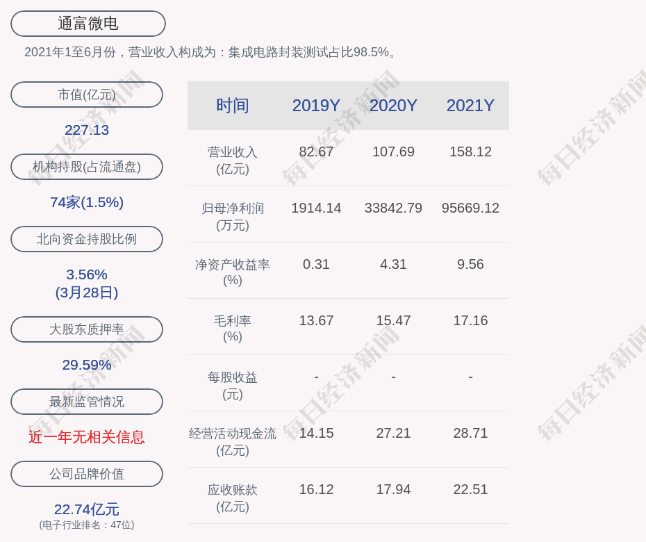 每经AI快讯,通富微电(SZ 002156,收盘价:17.09元)3月29日晚间发布年度业绩报告称,2021年营业收入约158.12亿元,同比增加46.84%;归属于上市公司股东的净利润盈利约9.57亿元,同比增加182.69%;基本每股收益盈利0.7198元,同比增加151.59%。不分红、不送红股、不转增。