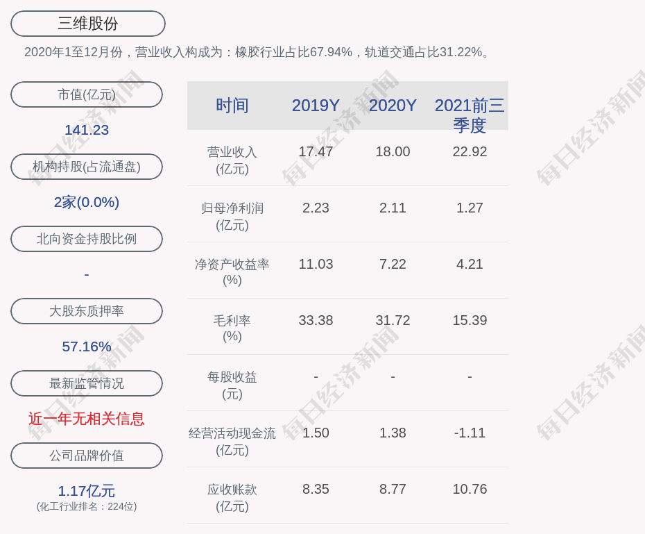 2020年1至12月份,三维股份的营业收入构成为:橡胶行业占比67.94%,轨道交通占比31.22%。