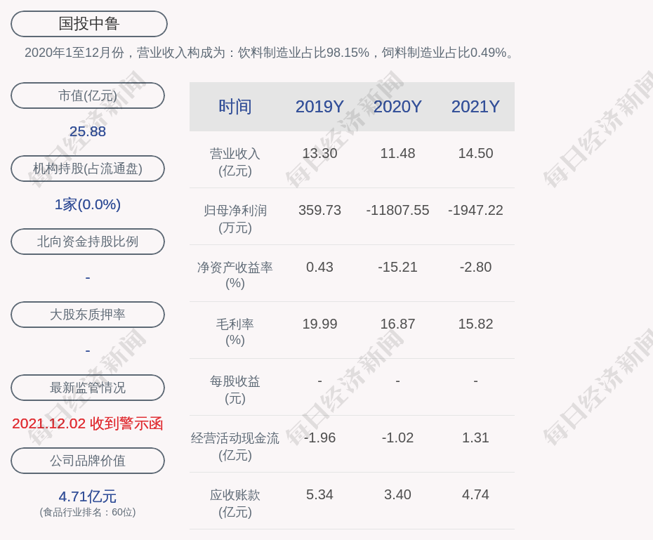 2020年1至12月份,国投中鲁的营业收入构成为:饮料制造业占比98.15%,饲料制造业占比0.49%。