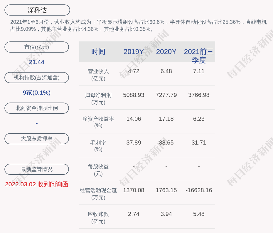 2021年1至6月份,深科达的营业收入构成为:平板显示模组设备占比60.8%,半导体自动化设备占比25.36%,直线电机占比9.09%,其他主营业务占比4.36%,其他业务占比0.35%。