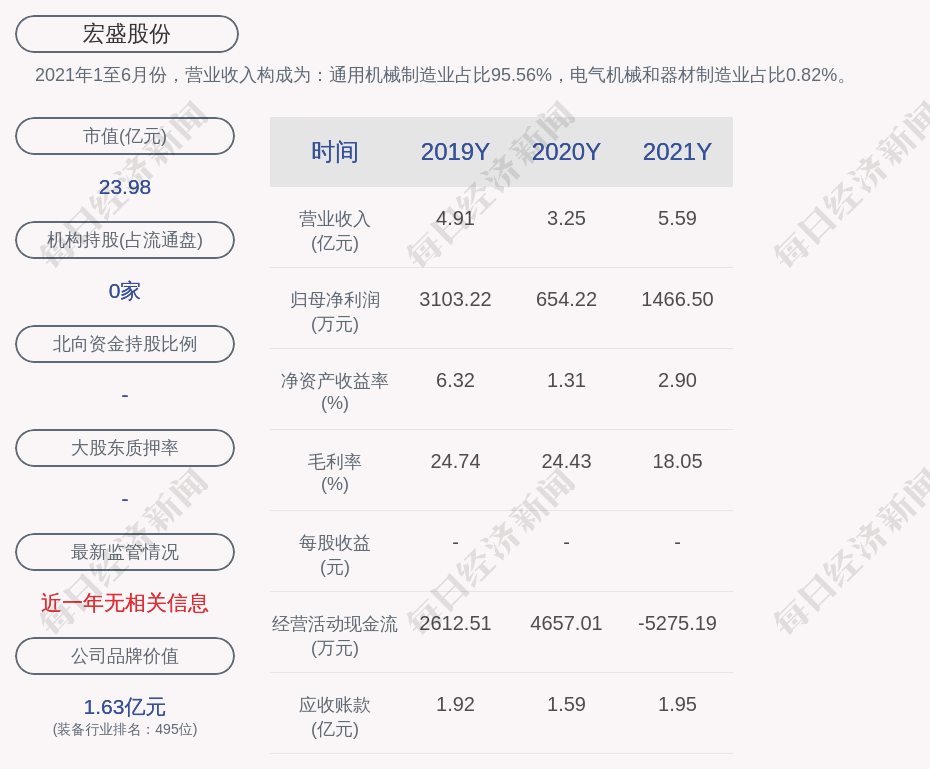 2021年1至6月份,宏盛股份的营业收入构成为:通用机械制造业占比95.56%,电气机械和器材制造业占比0.82%。