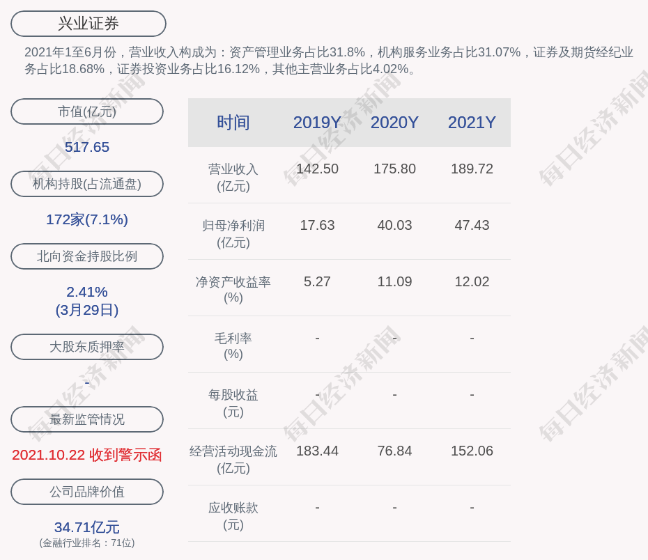 每经AI快讯,兴业证券(SH 601377,收盘价:7.73元)3月30日晚间发布年度业绩报告称,2021年营业收入约189.72亿元,同比增加7.92%;归属于上市公司股东的净利润约47.43亿元,同比增加18.48%;基本每股收益0.7083元,同比增加18.48%。公司不进行利润分配、公积金转增股本。