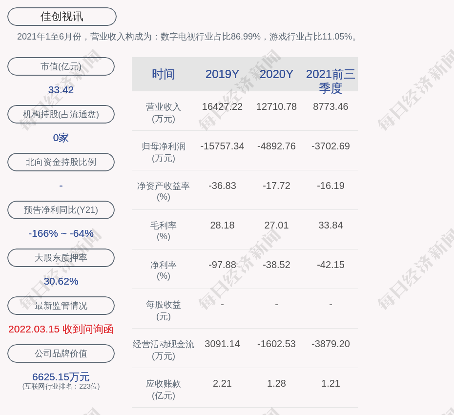2021年1至6月份,佳创视讯的营业收入构成为:数字电视行业占比86.99%,游戏行业占比11.05%。