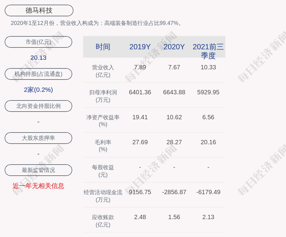 2020年1至12月份,德马科技的营业收入构成为:高端装备制造行业占比99.47%。