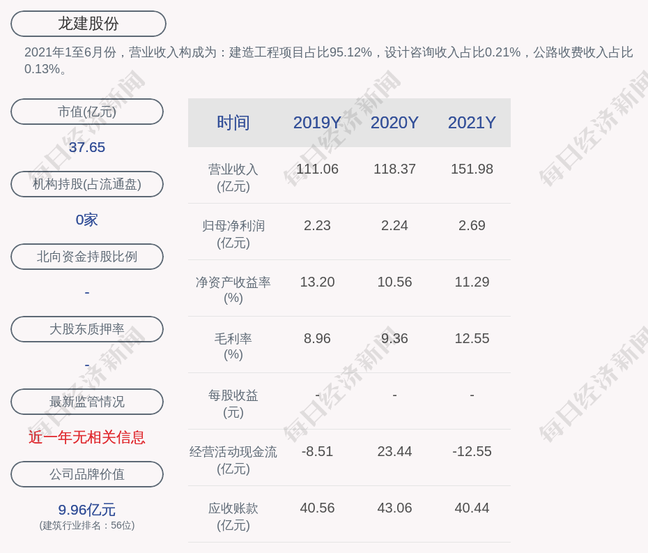 2021年1至6月份,龙建股份的营业收入构成为:建造工程项目占比95.12%,设计咨询收入占比0.21%,公路收费收入占比0.13%。