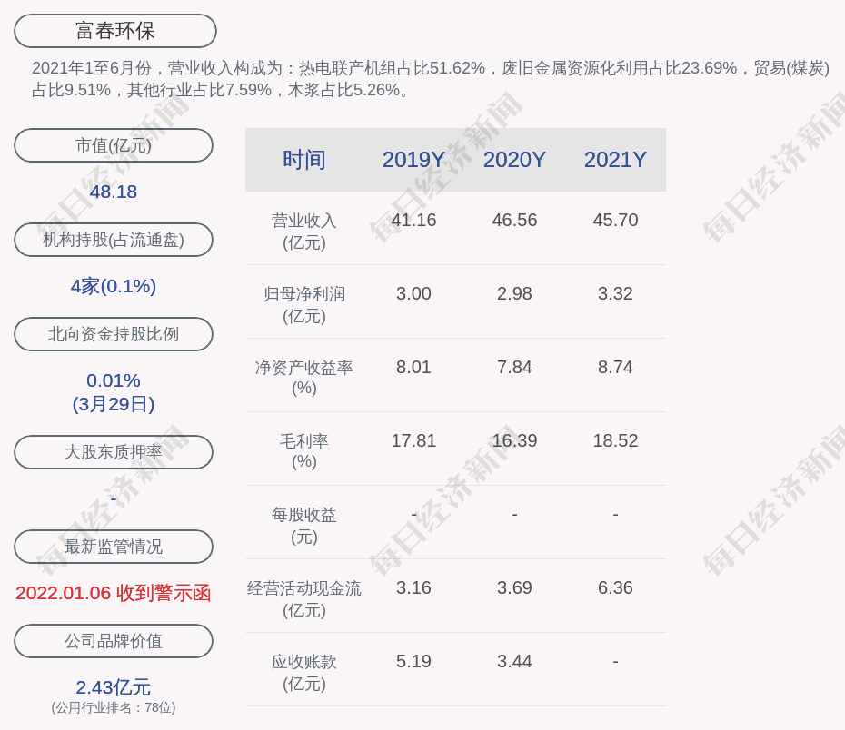 2021年1至6月份,富春环保的营业收入构成为:热电联产机组占比51.62%,废旧金属资源化利用占比23.69%,贸易(煤炭)占比9.51%,其他行业占比7.59%,木浆占比5.26%。