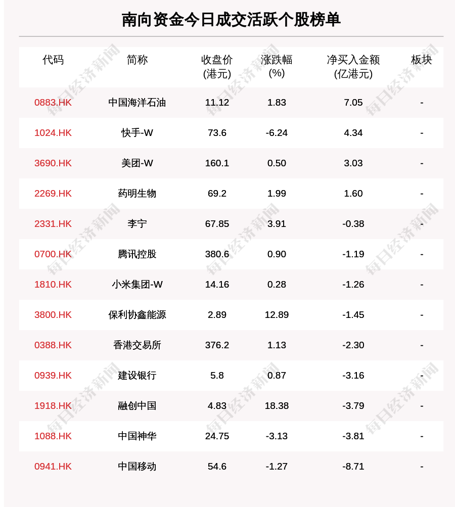 南向资金成交活跃个股榜单中,净买入个股共4只,金额最多的是中国海洋石油(0883.HK,收盘价:11.12港元),净买入7.047亿港元;净卖出个股共9只,金额最多的是中国移动(0941.HK,收盘价:54.6港元),净卖出8.715亿港元。