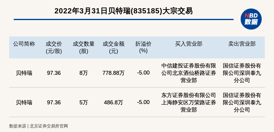 每经讯,2022年3月31日,北交所上市公司贝特瑞(835185)发生2笔大宗交易,总成交金额为1265.68万元,成交金额最高的一笔成交价97.36元/股,成交数量8万股,成交金额778.88万元,折价5%。买入营业部是中信建投证券股份有限公司北京酒仙桥路证券营业部,卖出营业部是国信证券股份有限公司深圳泰九分公司。