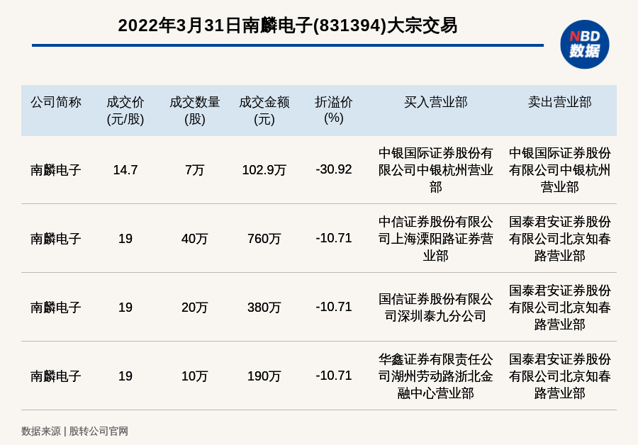每经讯,2022年3月31日,新三板基础层公司南麟电子(831394)发生4笔大宗交易,折价率最高的一笔成交价14.7元/股,成交数量7万股,成交金额102.9万元,折价30.92%。买入营业部是中银国际证券股份有限公司中银杭州营业部,卖出营业部是中银国际证券股份有限公司中银杭州营业部。
