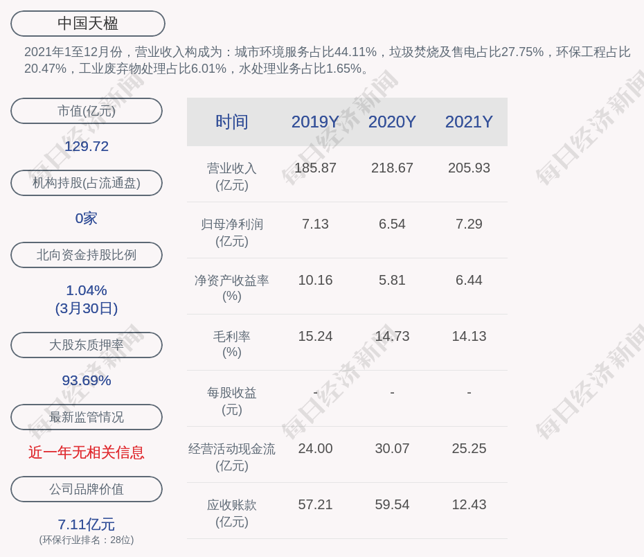 2021年1至12月份,中国天楹的营业收入构成为:城市环境服务占比44.11%,垃圾焚烧及售电占比27.75%,环保工程占比20.47%,工业废弃物处理占比6.01%,水处理业务占比1.65%。