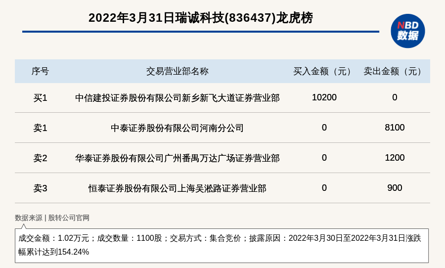 每经讯,2022年3月31日,新三板创新层公司瑞诚科技(836437)登上龙虎榜,交易方式是集合竞价,披露原因是2022年3月30日至2022年3月31日涨跌幅累计达到154.24%,成交数量1100股,成交金额1.02万元。买一席位为中信建投证券股份有限公司新乡新飞大道证券营业部,买入1.02万元;卖一席位为中泰证券股份有限公司河南分公司,卖出8100元。