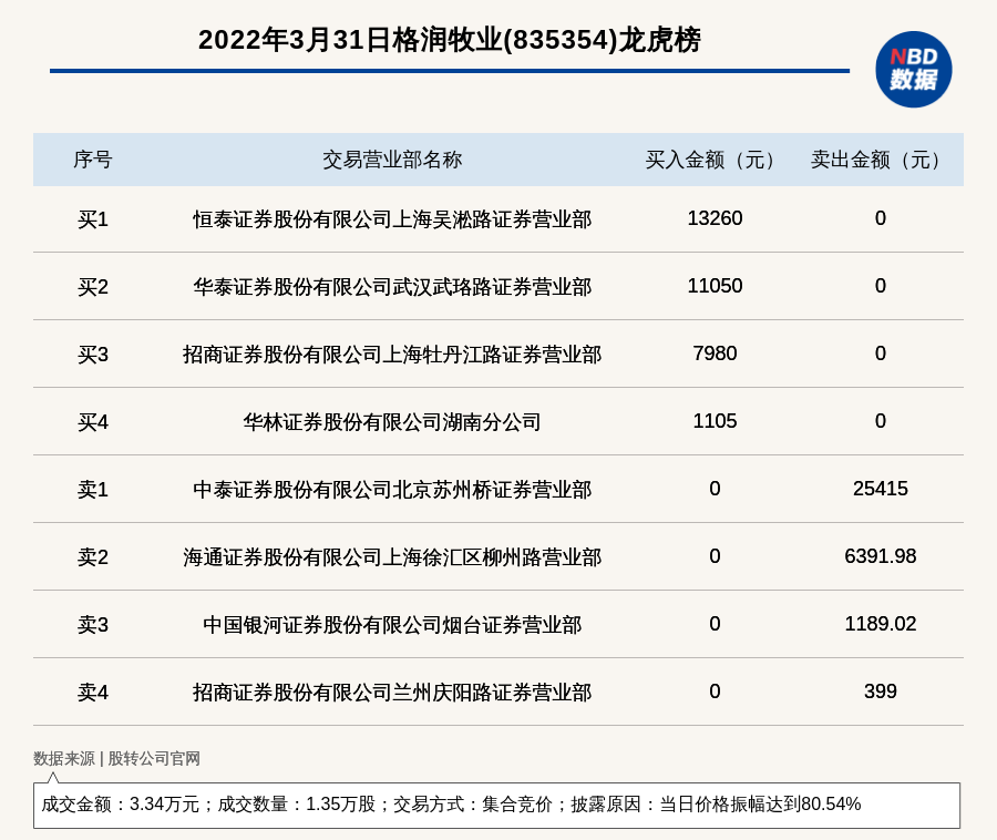 每经讯,2022年3月31日,新三板创新层公司格润牧业(835354)登上龙虎榜,交易方式是集合竞价,披露原因是当日价格振幅达到80.54%,成交数量1.35万股,成交金额3.34万元。买一席位为恒泰证券股份有限公司上海吴淞路证券营业部,买入1.33万元;卖一席位为中泰证券股份有限公司北京苏州桥证券营业部,卖出2.54万元。