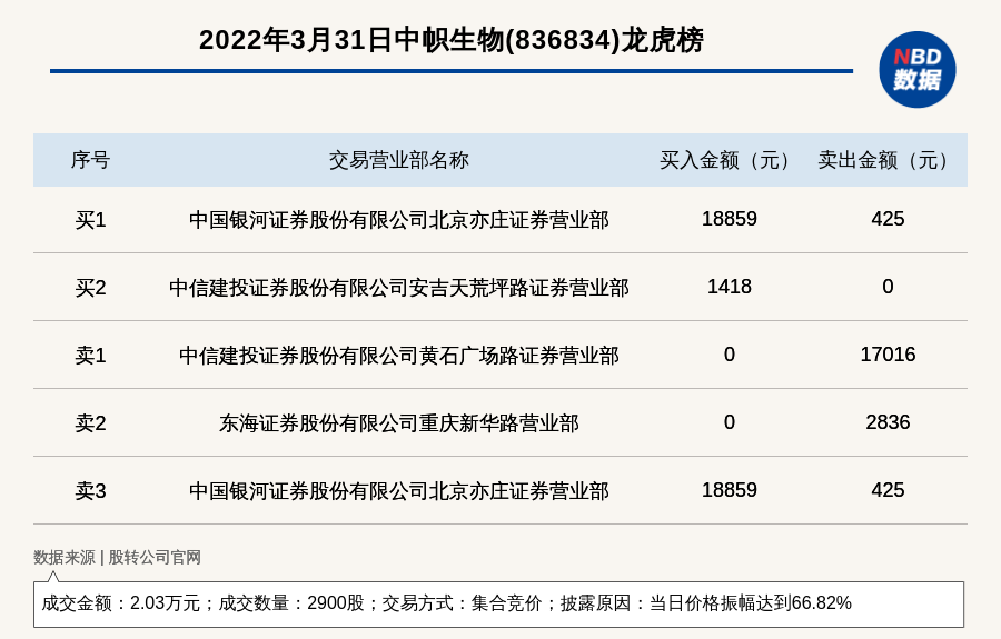 每经讯,2022年3月31日,新三板基础层公司中帜生物(836834)登上龙虎榜,交易方式是集合竞价,披露原因是当日价格振幅达到66.82%,成交数量2900股,成交金额2.03万元。买一席位为中国银河证券股份有限公司北京亦庄证券营业部,买入1.89万元;卖一席位为中信建投证券股份有限公司黄石广场路证券营业部,卖出1.7万元。