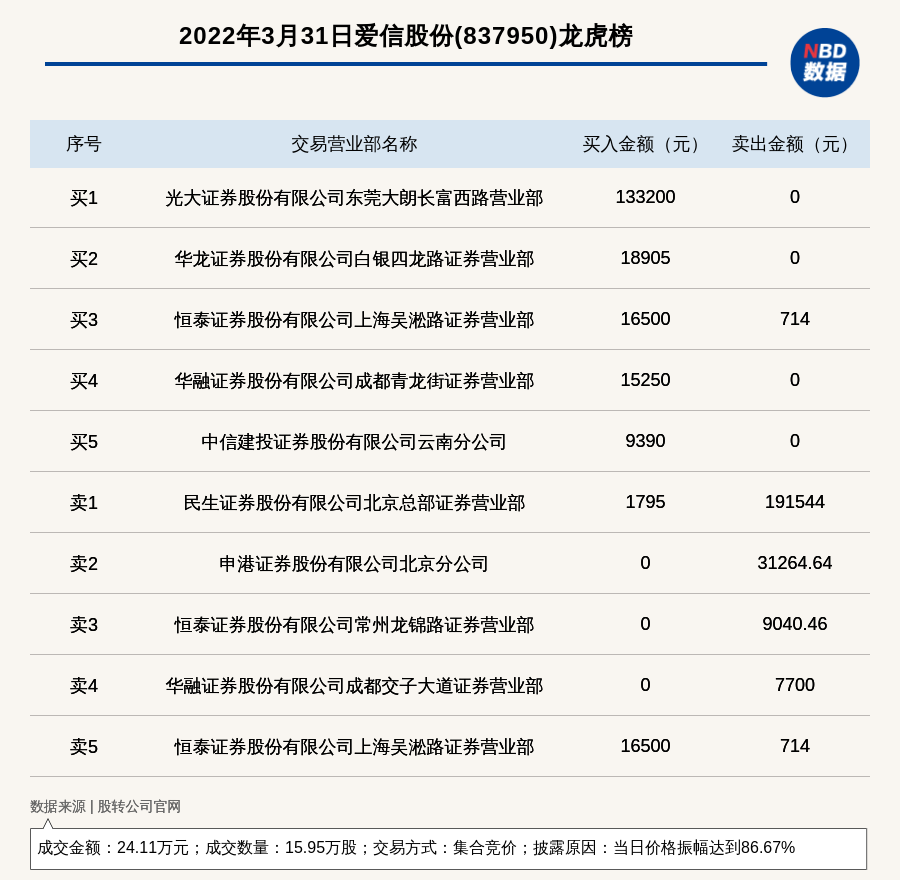 每经讯,2022年3月31日,新三板创新层公司爱信股份(837950)登上龙虎榜,交易方式是集合竞价,披露原因是当日价格振幅达到86.67%,成交数量15.95万股,成交金额24.11万元。买一席位为光大证券股份有限公司东莞大朗长富西路营业部,买入13.32万元;卖一席位为民生证券股份有限公司北京总部证券营业部,卖出19.15万元。
