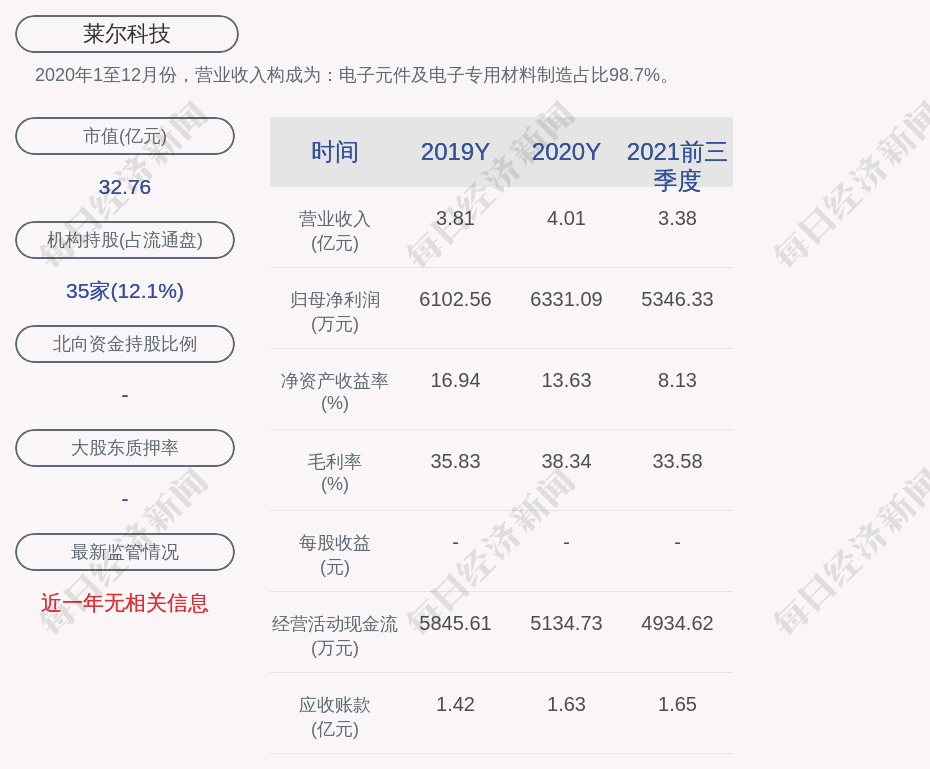 2020年1至12月份,莱尔科技的营业收入构成为:电子元件及电子专用材料制造占比98.7%。