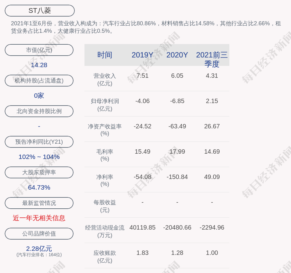 2021年1至6月份,ST八菱的营业收入构成为:汽车行业占比80.86%,材料销售占比14.58%,其他行业占比2.66%,租赁业务占比1.4%,大健康行业占比0.5%。