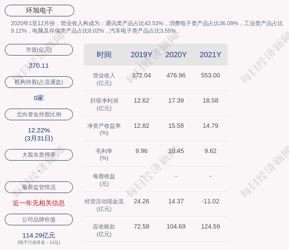 2020年1至12月份,环旭电子的营业收入构成为:通讯类产品占比42.53%,消费电子类产品占比36.09%,工业类产品占比9.12%,电脑及存储类产品占比8.02%,汽车电子类产品占比3.55%。
