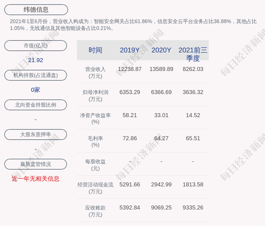 2021年1至6月份,纬德信息的营业收入构成为:智能安全网关占比61.86%,信息安全云平台业务占比36.88%,其他占比1.05%,无线通信及其他智能设备占比0.21%。