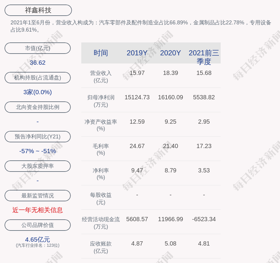 2021年1至6月份,祥鑫科技的营业收入构成为:汽车零部件及配件制造业占比66.89%,金属制品占比22.78%,专用设备占比9.61%。