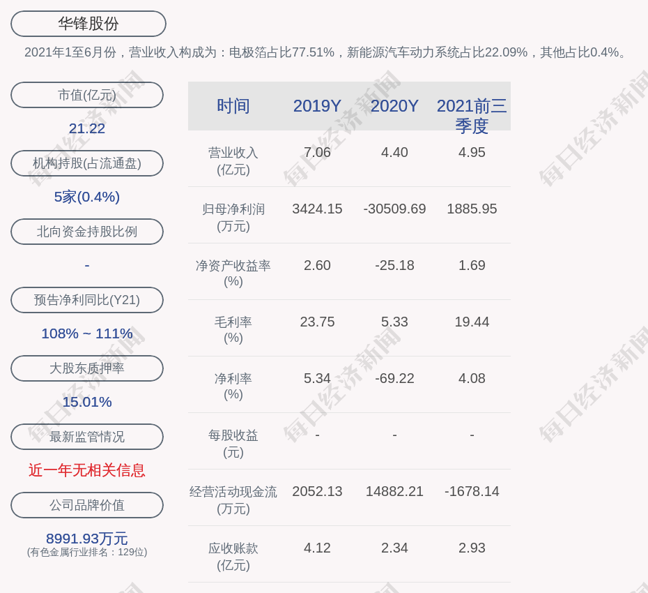 2021年1至6月份,华锋股份的营业收入构成为:电极箔占比77.51%,新能源汽车动力系统占比22.09%,其他占比0.4%。