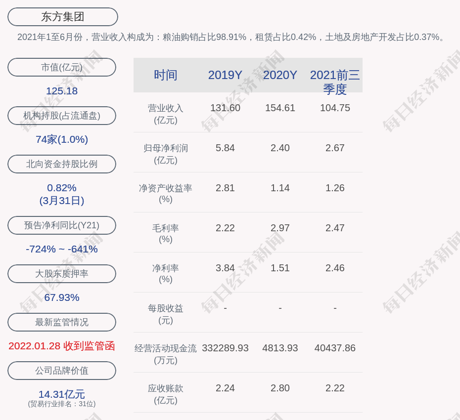 2021年1至6月份,东方集团的营业收入构成为:粮油购销占比98.91%,租赁占比0.42%,土地及房地产开发占比0.37%。