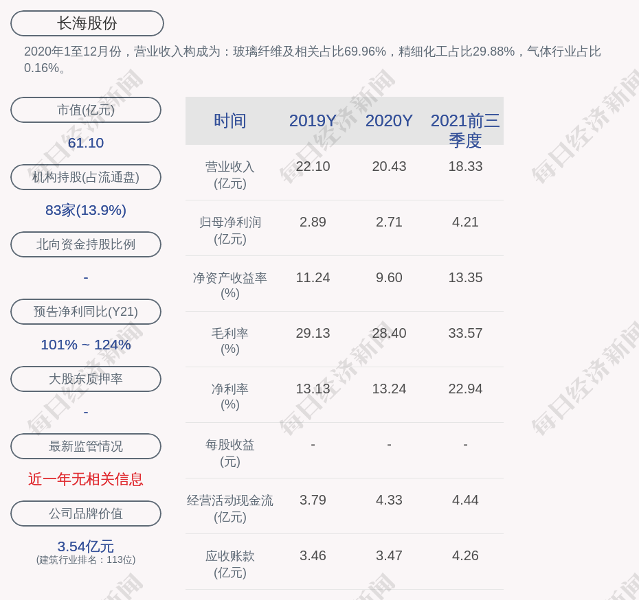 2020年1至12月份,长海股份的营业收入构成为:玻璃纤维及相关占比69.96%,精细化工占比29.88%,气体行业占比0.16%。