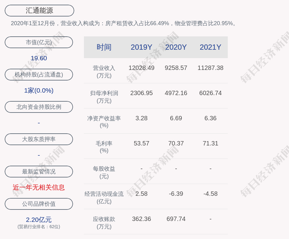 2020年1至12月份,汇通能源的营业收入构成为:房产租赁收入占比66.49%,物业管理费占比20.95%。