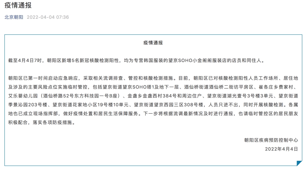 4月4日,据“北京朝阳”公众号,截至4月4日7时,朝阳区新增5名新冠核酸检测阳性,均为专营韩国服装的望京SOHO小金阁阁服装店的店员和同住人。