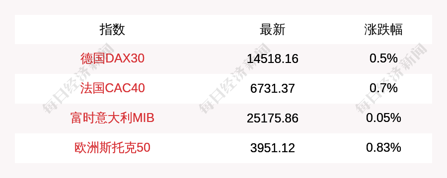 每经AI快讯:北京时间4月5日00:30,德国DAX30指数收盘上涨71.68点,涨幅为0.5%,报收14518.16点;法国CAC40指数收盘上涨47.06点,涨幅为0.7%,报收6731.37点;富时意大利MIB指数收盘上涨12.56点,涨幅为0.05%,报收25175.86点;欧洲斯托克50指数收盘上涨32.44点,涨幅为0.83%,报收3951.12点。