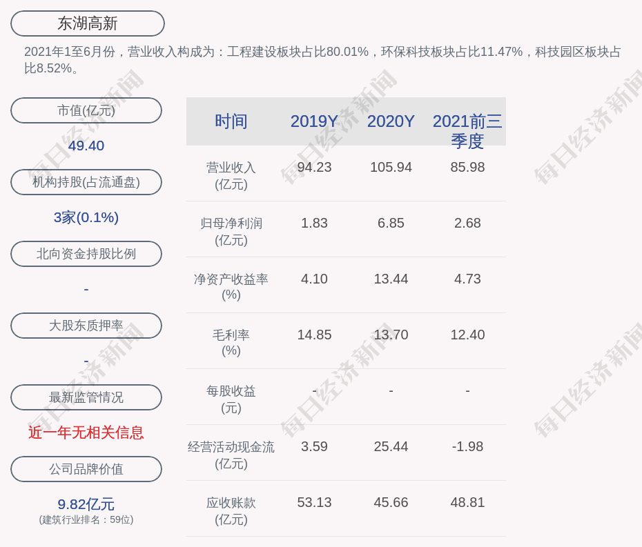 2021年1至6月份,东湖高新的营业收入构成为:工程建设板块占比80.01%,环保科技板块占比11.47%,科技园区板块占比8.52%。
