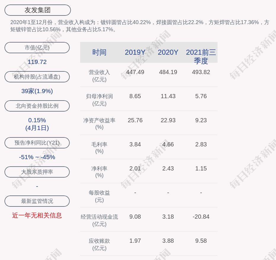 2020年1至12月份,友发集团的营业收入构成为:镀锌圆管占比40.22%,焊接圆管占比22.2%,方矩焊管占比17.36%,方矩镀锌管占比10.56%,其他业务占比5.17%。