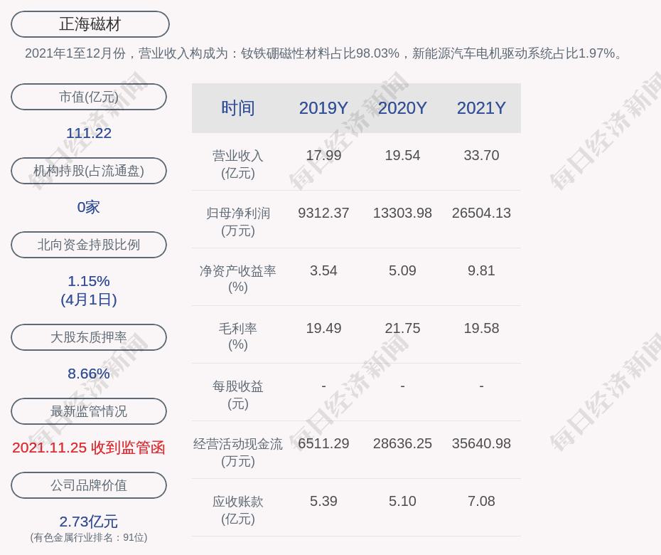 2021年1至12月份,正海磁材的营业收入构成为:钕铁硼磁性材料占比98.03%,新能源汽车电机驱动系统占比1.97%。